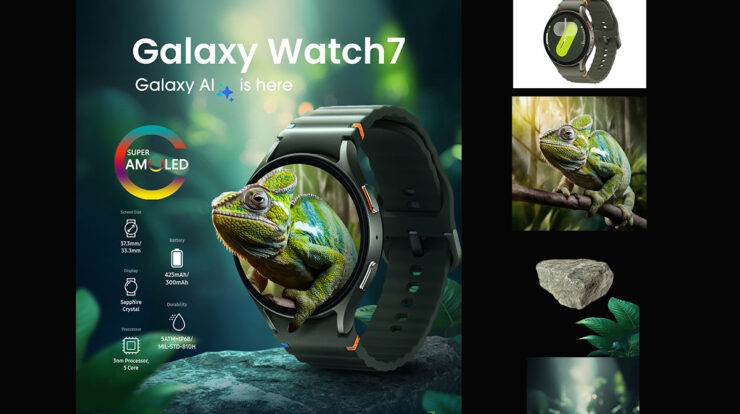 In today’s competitive technology market, creating an eye-catching and unique product poster is essential. This article will show you how to design a stunning Samsung Galaxy Watch7 poster using photo manipulation techniques in Adobe Photoshop, with a focus on the “pop-out effect” – where a chameleon appears to emerge from the smartwatch screen.